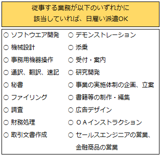 業務が以下に当てはまる場合には、日雇い派遣で働くことが可能です。「適正な雇用管理に支障を及ぼす恐れがないと認める業務」として、例外となっています。