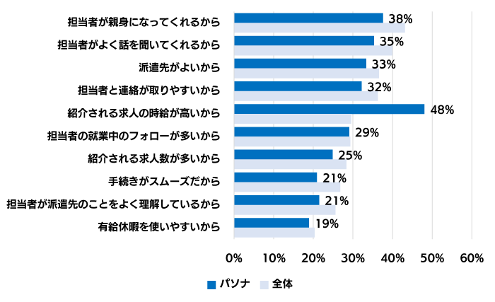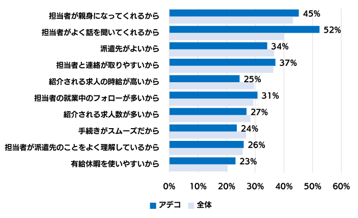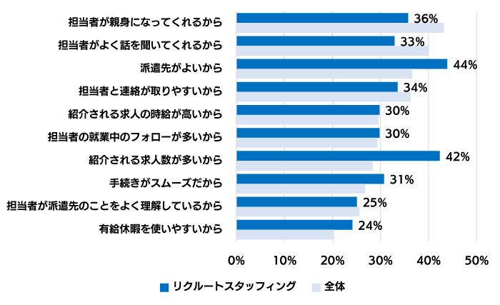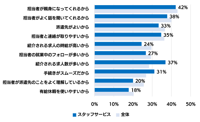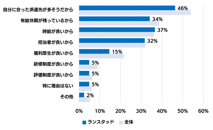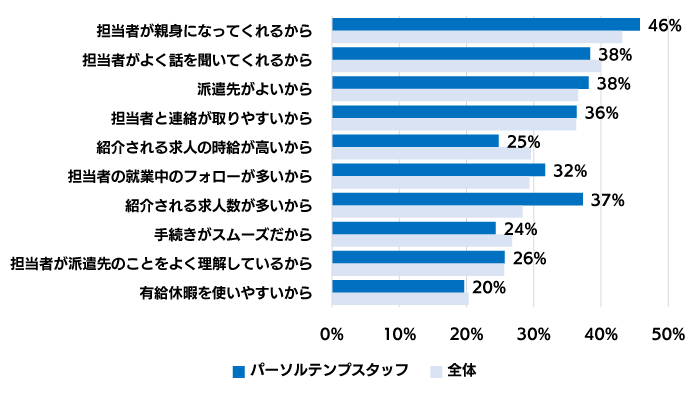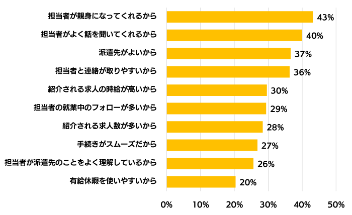 一方3位は「派遣先がよいから(37%)」が挙がり、担当者の対応に関する項目「担当者と連絡が取りやすいから(36%)」「担当者の就業中のフォローが多いから(29%)」よりも回答数の割合が高い結果となっています。