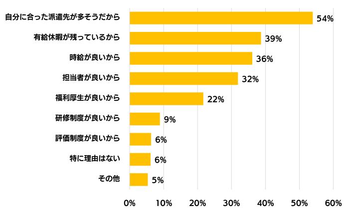 継続して就業したい理由で最も多かったのは、「自分に合った派遣先が多そうだから(54%)」。1位に関しては、昨年同様の結果となりました。また、2位以降とは15ポイント以上の差があり、継続したい理由として大きく起因していると見受けられます。