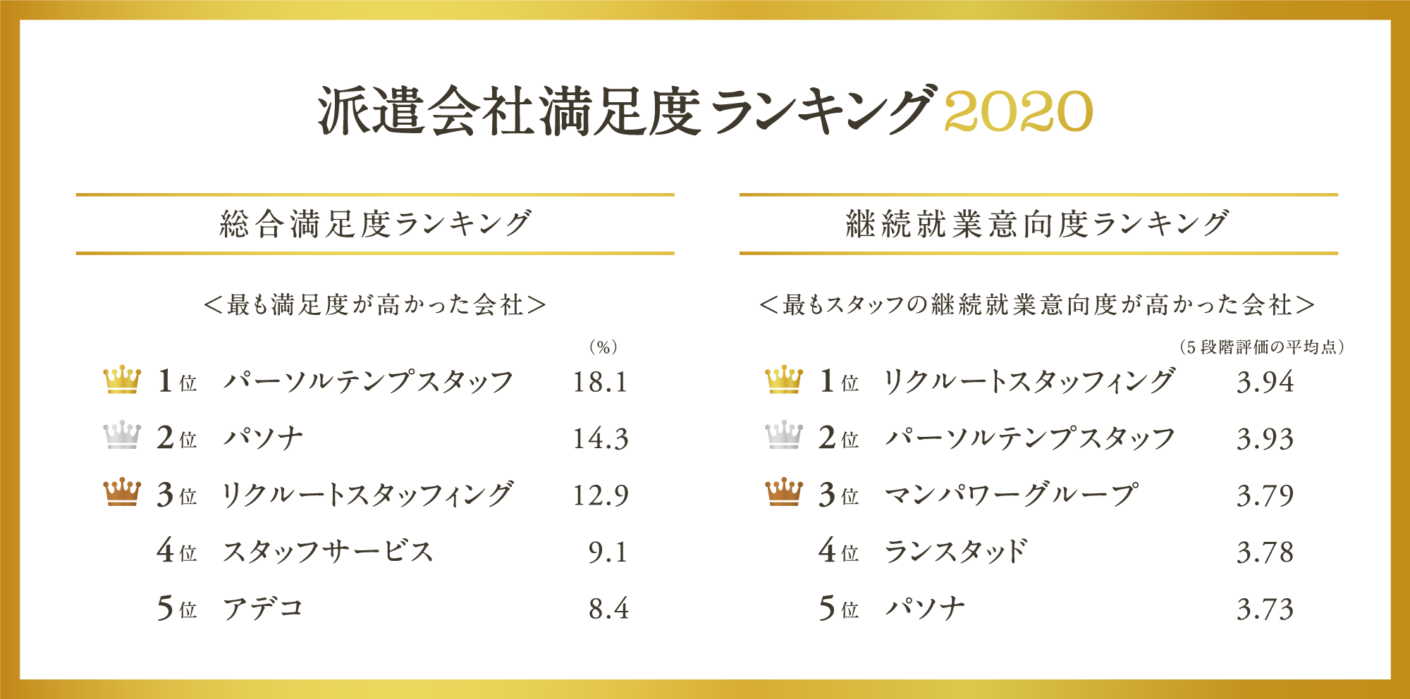 今回の調査では、「総合満足度」でパーソルテンプスタッフが1位、「継続就業意向度」でリクルートスタッフィングが1位となり、昨年同様の結果となりました。
