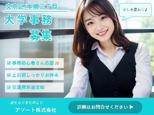 | 勤務地 | 東京都文京区 丸ノ内線・大江戸線 「本郷三丁目駅」から徒歩6分 南北線「東大前駅」から徒歩11分 千代田線「湯島駅」徒歩12分 |