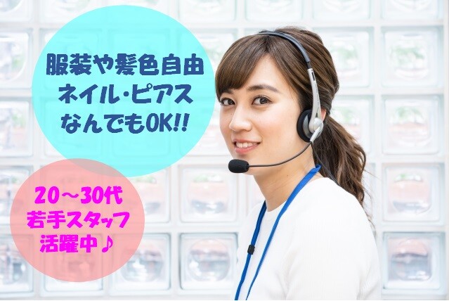 テレマーケティング・テレフォンオペレーター・コールセンター 応募資格 職種未経験OK / ブランクOK / 英語力不要 ・コールセンターの経験がある方歓迎!もちろん未経験からチャレンジしたい方も〇・1年以上のブランクがある方も歓迎 <自分スタイルで勤務できる> ・髪型、髪色自由(規定はありません) ・服装自由 ・ネイル、アクセサリーOK 職場の雰囲気 年齢層