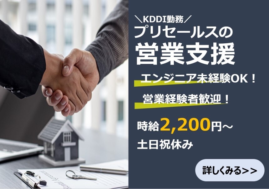 営業・企画営業・ラウンダー 応募資格 職種未経験OK / ブランクOK / 英語力不要 ※在宅勤務予定日でも、必要に応じて出社いただく場合があります。職種未経験OK! 【必須スキル】 ・コミュニケーションスキル ・Microsoft Officeの基本操作(Excel、PowerPoint、Outlook) 【歓迎スキル】 ・PowerPointでの資料作成のご経験 ・ネットワークの知識(ITパスポートレベル) ★週1~2回の在宅ワークも導入中(業務習得後) |