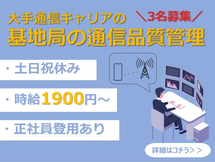 運用管理・保守 応募資格 職種未経験OK / ブランクOK / 英語力不要 職種未経験OK!【必須スキル】 ・第一級陸上特殊無線技士資格をお持ちの方 ・Excelの実務経験(SUM、AVERAGE等の基本関数) 【歓迎スキル】※いずれかある方歓迎! ・エリア品質改善、エリア設計等の移動体設備に関するご経験 ・Python/RPA等のDXツールの知識 #初めての派遣歓迎 職場の雰囲気 年齢層