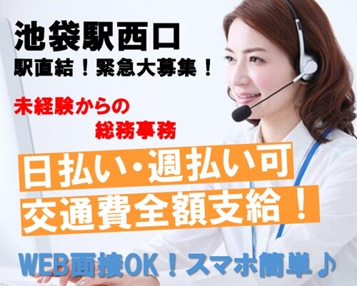 池袋駅直結で雨に濡れず通勤ラクラク 総務部で、社員みんなが気持ちよく働ける環境を一緒に作るお仕事です。「事務は初めてで不安…」そんな方も大丈夫!OJTで先輩が丁寧に教えてくれます。入社手続きや備品管理、データ入力、電話対応など、幅広く会社を支えるポジションです。