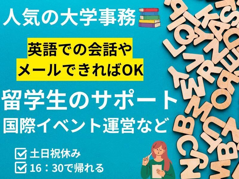 ▼学校の国際課で海外へ留学した学生のサポートのため、窓口対応や資料作成などをお願いします。▼電話やメールで英語での対応もあります!▼勤務時間も16時30分が定時なので、家庭との両立もしやすいですよ!学校事務に興味のある方、ぜひエントリーお待ちしています!≪オフィスカジュアル、休憩所あり、履歴書不要、電話登録、来社登録、WEB登録≫