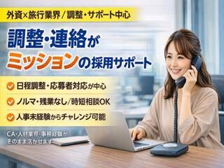 「調整業務に集中したい」方に最適!応募者・社内とのメール対応やスケジュール管理、データ入力などを担当します。電話はほぼなく、合否判断や交渉は社員が対応するため、集中できる環境です。20代~30代活躍中。複数ポジションを並行して管理しながら、段取り力を活かして働けます。落ち着いた環境で無理なく続けたい方におすすめです。