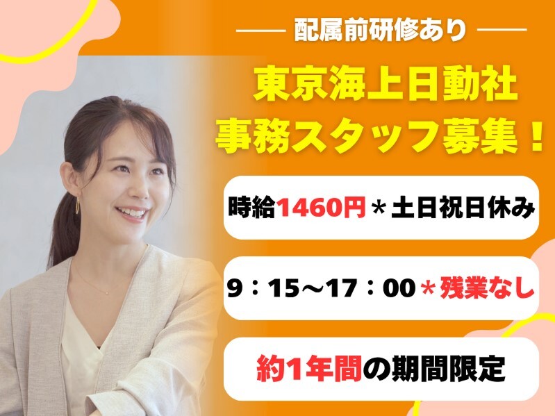 【保険事務】東京海上日動火災保険で、自賠責保険事務や損害保険申込書チェック、窓口対応を担当します。郵便受付や庶務業務も行います。配属前研修実施!保険事務のブランクがある方も安心して勤務スタート!