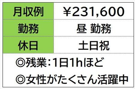 | 勤務時間 | 【昼勤務】8:00~17:00 残業時間 月 20 時間程度発生することがございます。 ☆月収例 231600円♪ 〈所定168h×1200円 +残業20h×1500円〉 |