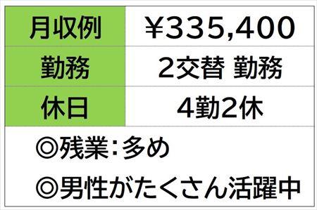 | 勤務時間 | 【交替勤務】 残業時間 月 60 時間程度発生することがございます。 ☆月収例 335400円♪ 〈所定168h×1300円 +残業60h×1625円+深夜60h×325円〉 |