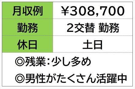 | 勤務時間 | 【交替勤務】 残業時間 月 30 時間程度発生することがございます。 ☆月収例 308700円♪ 〈所定168h×1400円 +残業30h×1750円+深夜60h×350円〉 |