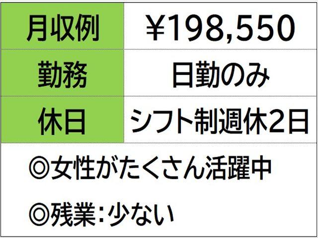 | 勤務時間 | 【昼勤務】8:00~17:00 残業時間 月 10 時間程度発生することがございます。 ☆月収例 198,550円♪ 〈所定168h×1100円+残業10h×1375円〉 |