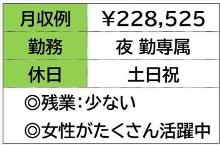 | 勤務時間 | 【勤務時間】 残業時間 月 15 時間程度発生することがございます。 ☆月収例 228525円♪ 〈所定168h×1100円 +残業15h×1375円+深夜84h×275円〉 |