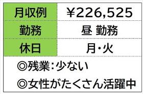 | 勤務時間 | 【昼勤務】9:45~18:45 残業時間 月 5 時間程度発生することがございます。 ☆月収例 226525円♪ 〈所定168h×1300円 +残業5h×1625円〉 |