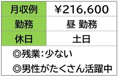 | 勤務時間 | 【昼勤務】7:30~16:30 残業時間 月 10 時間程度発生することがございます。 ☆月収例 216、600円♪ 〈所定168h×1200円 +残業10h×1500円〉 |