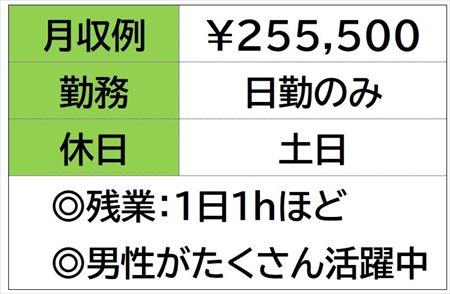 | 勤務時間 | 【日勤のみ】 残業時間 月 20 時間程度発生することがございます。 ☆月収例 255、500円♪ 〈所定157.5h×1400円+残業20h×1750円〉 |