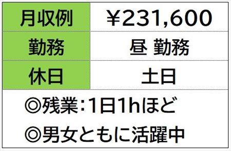 | 勤務時間 | 【昼勤務】8:00~17:00 残業時間 月 20 時間程度発生することがございます。 ☆月収例 231、600円♪ 〈所定168h×1200円 +残業20h×1500円〉 |