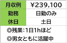 | 勤務時間 | 【昼勤務】8:30~17:00 残業時間 月 25 時間程度発生することがございます。 ☆月収例 239、100円♪ 〈所定168h×1200円 +残業25h×1500円〉 |