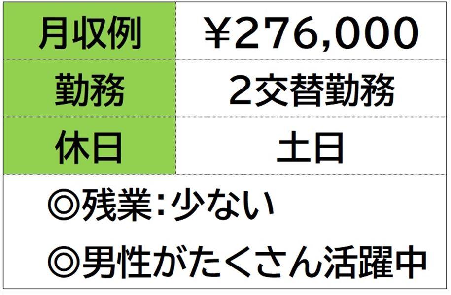 | 勤務時間 | 【交替勤務】 残業時間 月 10 時間程度発生することがございます。 ☆月収例 276、000円♪ 〈所定162.75h×1500円 +残業10h×1875円+深夜35h×375円〉 |