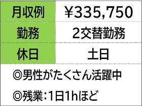 | 勤務時間 | 【交替勤務】 残業時間 月 20 時間程度発生することがございます。 ☆月収例 335、750円♪ 〈所定157.5h×1700円 +残業20h×2125円+深夜60h×425円〉 |
