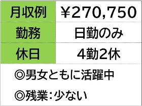 | 勤務時間 | 【昼勤務】8:00~17:00 残業時間 月 10 時間程度発生することがございます。 ☆月収例 270,750円♪ 〈所定168h×1500円+残業10h×1875円〉 |